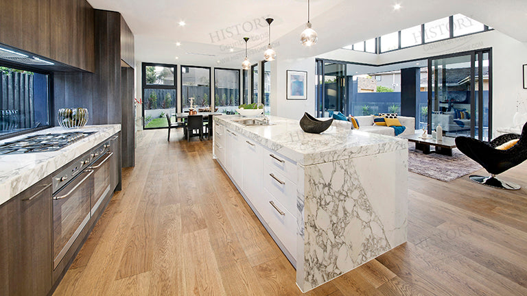 Het Arabescato marmeren keukenblad is een lichtbruine marmersteen met verfijnde wit-crèmekleurige aders die het keukenblad een warme en luxe uitstraling geven. Dit natuursteen combineert stijl en functionaliteit en is daarnaast perfect geschikt als vloertegel, wandtegel en badkamertegel. Marmer in uw interieur is niet alleen een esthetische keuze, maar ook een duurzame en eenvoudig te onderhouden oplossing.